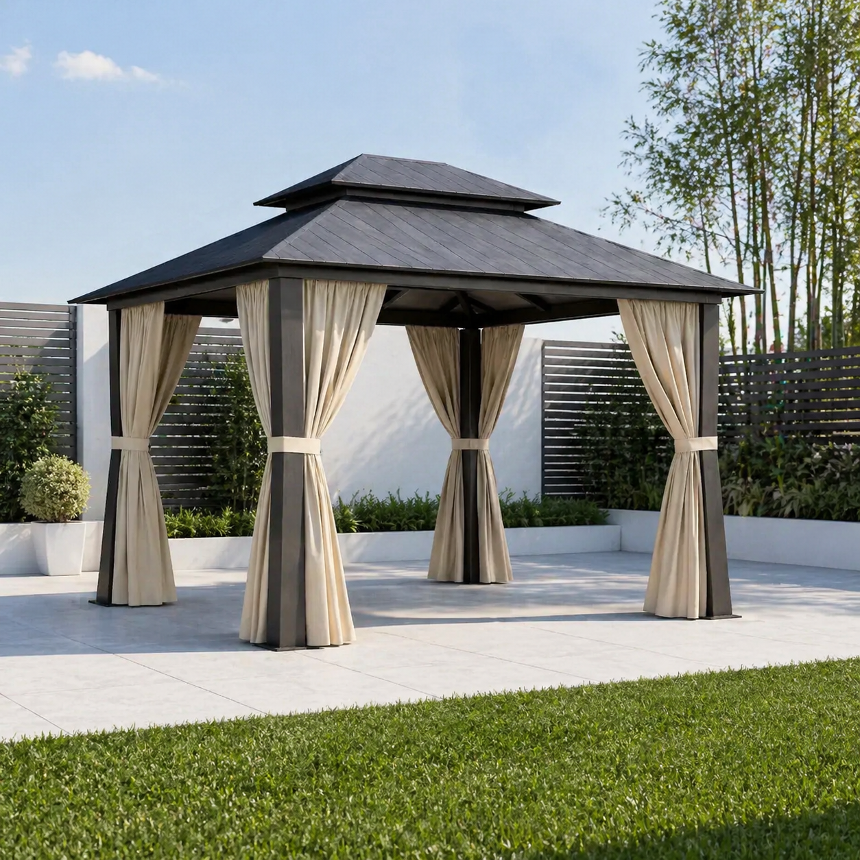 Dieser Pavillon hat ein schlichtes Design mit einem stabilen Gestell und einem überdachten Dach. Er bietet einen geschützten Bereich für Garten oder Terrasse und eignet sich für verschiedene Freizeitaktivitäten im Freien. Die Konstruktion wirkt stabil und die Farbgebung ist neutral, passend zu unterschiedlichen Außenbereichen.