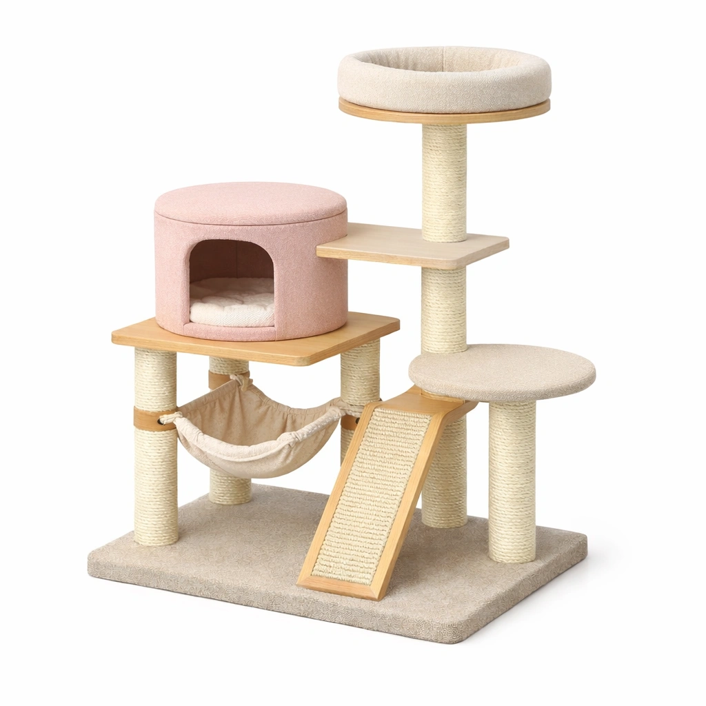 Der Aufbau umfasst 3 Ebenen mit Kratzsäule, Plattform, Leiter und Hängematte.