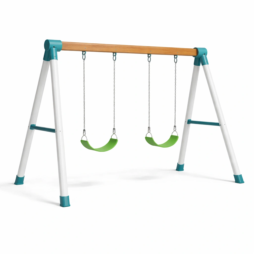Diese Doppelschaukel besteht aus einem stabilen Metallrahmen und einem Sitz aus strapazierfähigem Kunststoff. Die Ketten sind aus rostfreiem Stahl gefertigt. Die Schaukel ist für den Außenbereich geeignet.