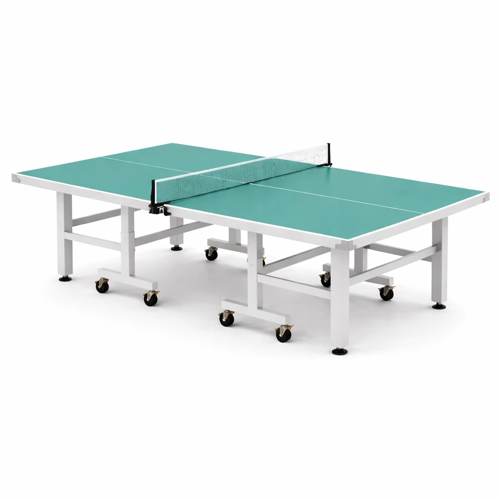 Die Tischtennisplatte besteht aus einer MDF-Oberfläche mit 18 mm Dicke und einem stabilen Metallrahmen. Sie ist klappbar und mit Rollen für einfachen Transport ausgestattet. Die Gesamtmaße betragen 274 cm Länge, 152.5 cm Breite und 76 cm Höhe. Die Platte hat eine maximale Tragfähigkeit von 100 kg. Die grüne Spielfläche bietet eine gute Sichtbarkeit des Balls.