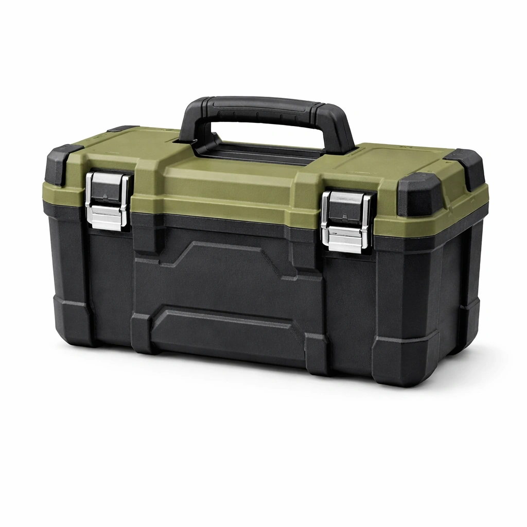 Dieser Werkzeugkoffer besteht aus strapazierfähigem Polypropylen und verfügt über zwei Metallverschlüsse für zusätzliche Sicherheit.